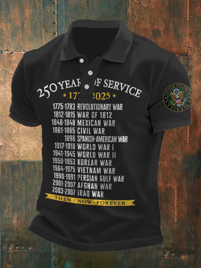 Vintage Men's United States Army 250 Years Of Service 1775-2025 Then - Now - Forever Printed Polo Shirt