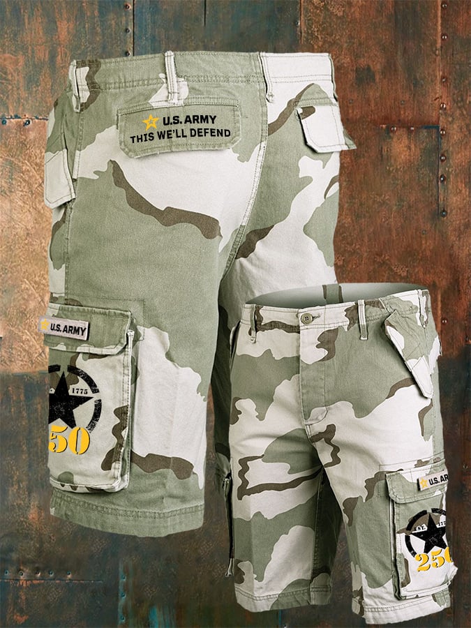Vintage U.S. Army 250th Anniversary This We'll Defend Est.1775 Camouflage Print Cargo Shorts