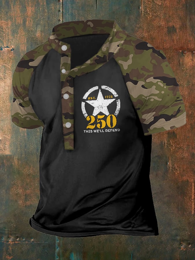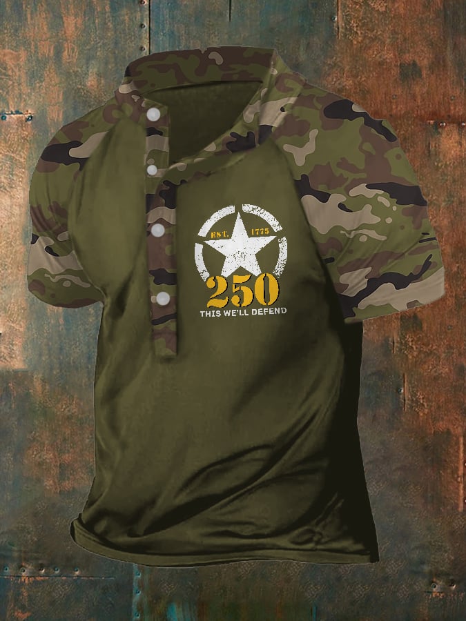 Man's Vintage Independence Day Camouflage United States Army 250th Anniversary This We'll Defend Est.1775 Printed Henley Shirt