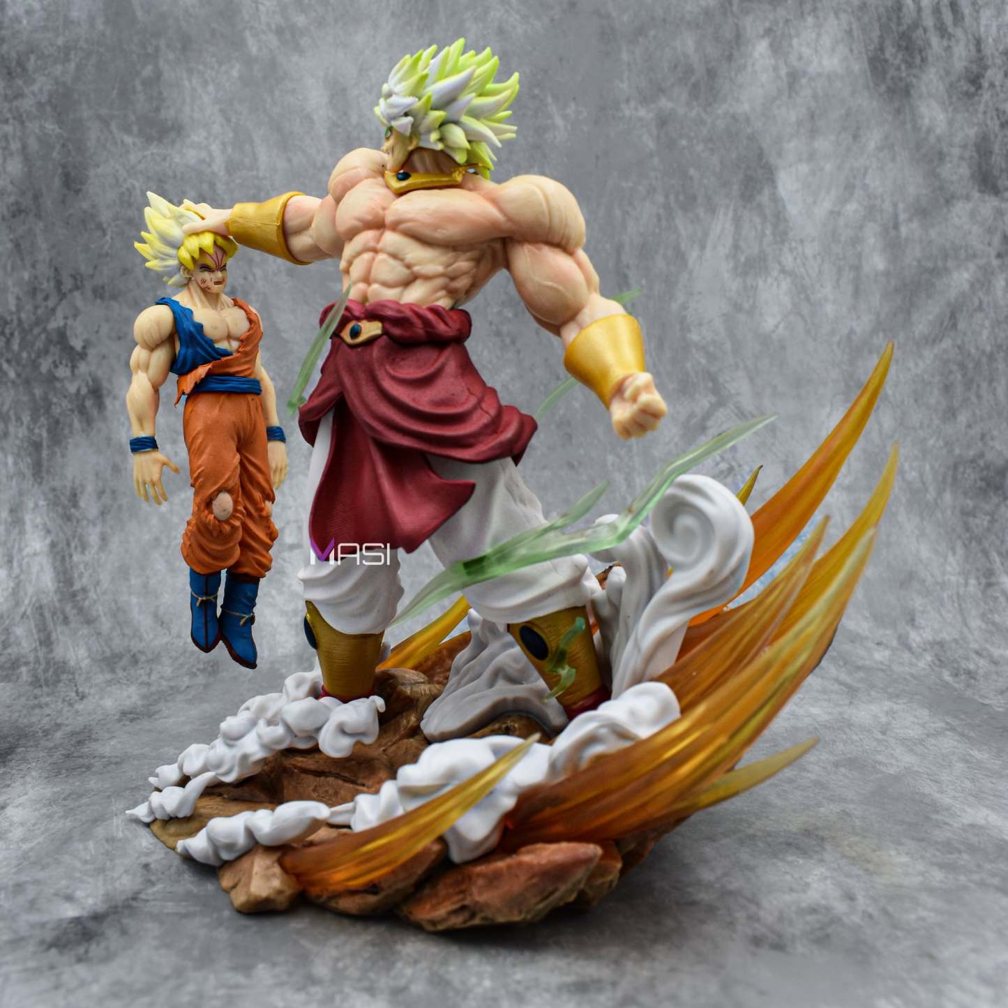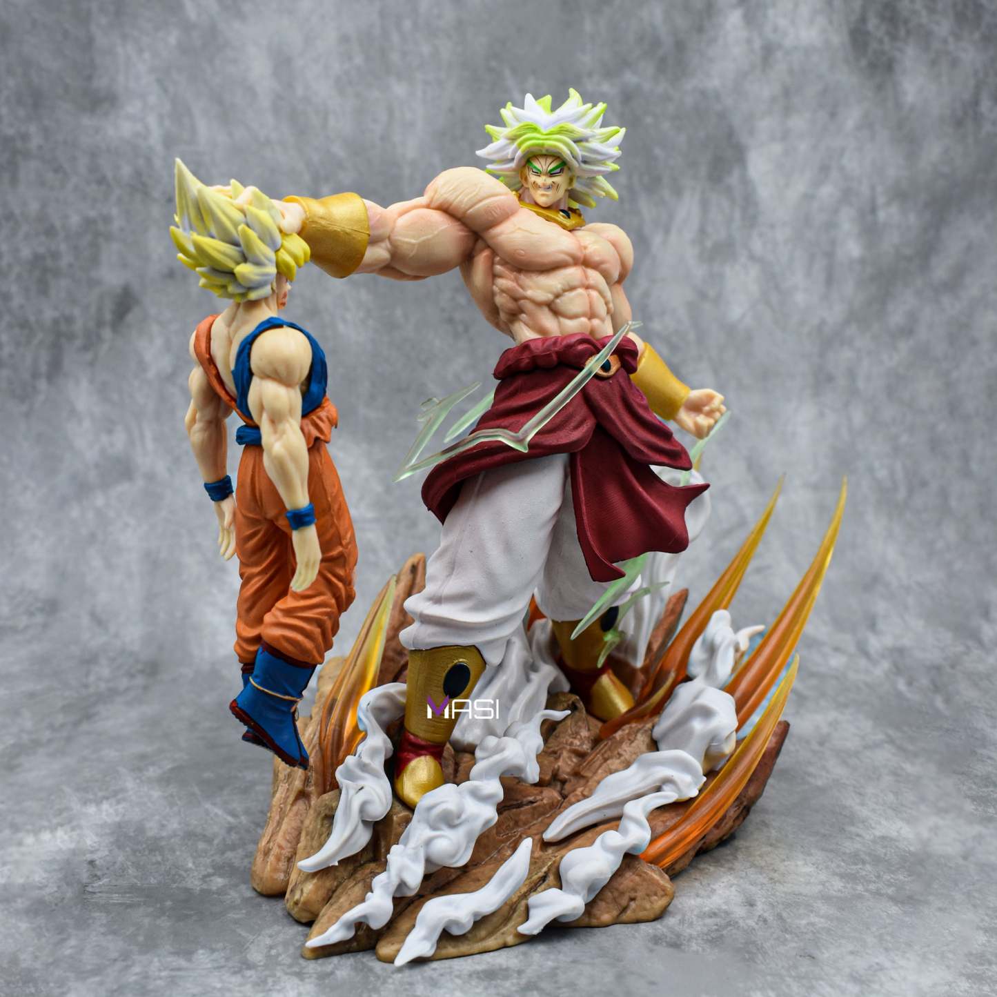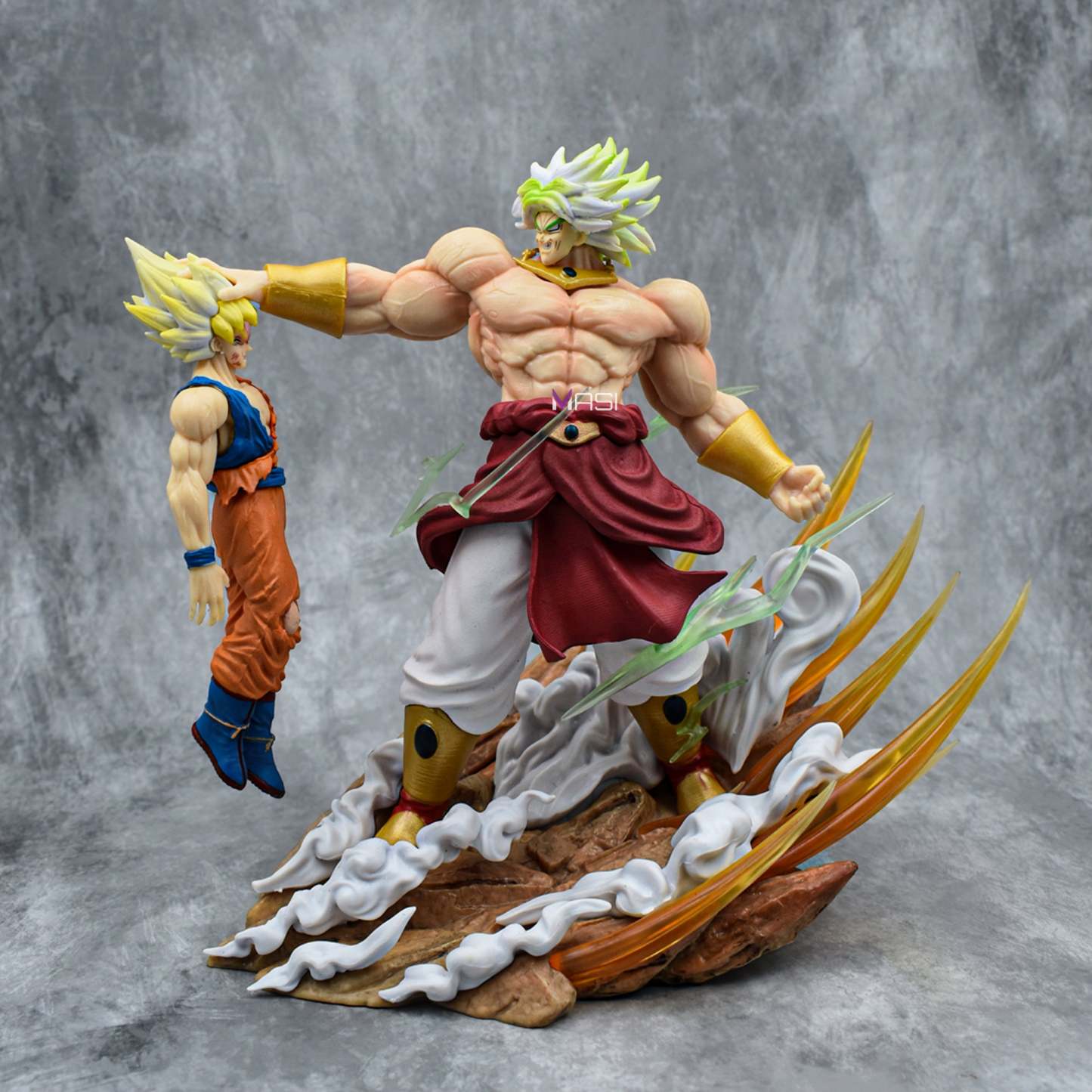 Witness the epic clash immortalized in this Broly destroying Goku iconic action figure, standing at an impressive 20 centimeters in height. Crafted from high-quality PVC, this figure captures the raw power and intensity of the battle scene. Broly, with his menacing expression and dynamic pose, looms over a broken Goku figure, showcasing intricate details like ripped clothing and battle scars. What sets this figure apart are the two replaceable heads included, allowing fans to display Broly in both his calm and enraged states, each head sculpted with meticulous attention to detail.
