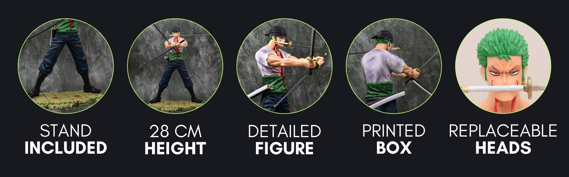 RORONOA ZORO THREE SWORD STYLE ICONIC ACTION FIGURE WIHT 2 REPLACEABLE HEADS (28 CM HEIGHT) - ONE PIECE