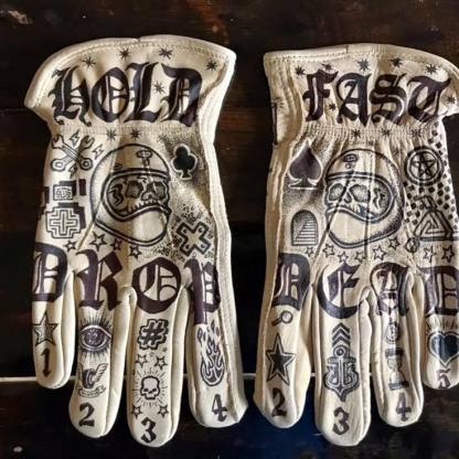 Step into the world of vintage American craftsmanship with these rugged leather work gloves 🛠️. Designed for the fearless and the free-spirited, these gloves are more than just workwear – they're a statement 💥. Made from premium leather, each pair is emblazoned with bold, tattoo-style graphics, including skulls ☠️, roses 🌹, and powerful phrases 💬. Whether you’re working on a project, hitting the open road on your bike 🏍️, or just embracing the raw spirit of American style 🇺🇸, these gloves are your perfect companion.