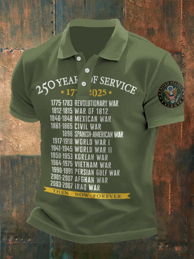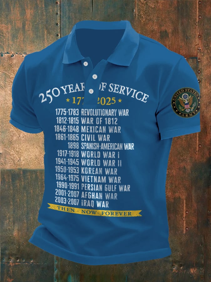 Vintage Men's United States Army 250 Years Of Service 1775-2025 Then - Now - Forever Printed Polo Shirt